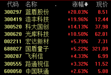 10月21日,量子通信概念尾盘拉升,截至发稿,蓝盾股份、浩丰科技拉升封板,科大国创、光库科技等快速跟涨。