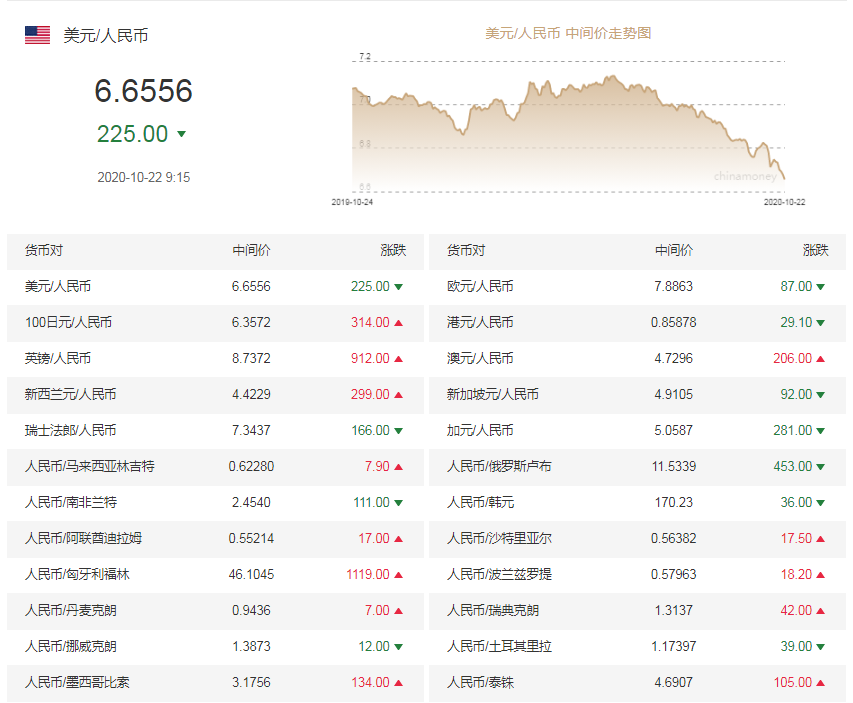 10月22日,中国外汇交易中心数据显示,人民币兑美元中间价调升225个基点,报6.6556,中间价升值至2018年7月11日以来最高。前一交易日中间价报6.6781,16:30收盘价报6.6575,23:30夜盘收报6.6502。