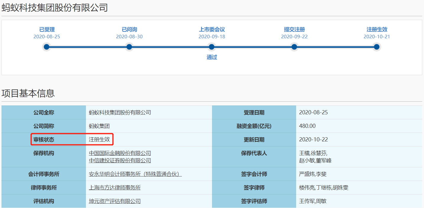 从项目详情页面可以看到,蚂蚁集团的申请于8月25日正式受理,8月30日进入审核问询程序,9月18日经上市委会议审议通过,9月22日提交注册,10月21日注册生效。
