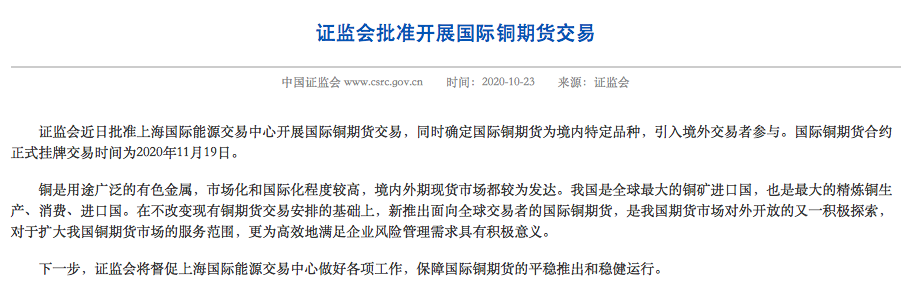 10月23日,证监会公告称,同意上海期货交易所(下称“上期所”)子公司上海国际能源交易中心(下称“上期能源”)开展国际铜期货交易。该合约将自2020年11月19日正式挂牌交易。