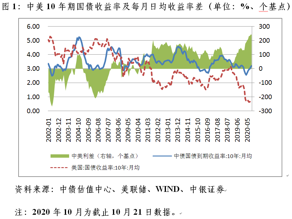 10月份,以10年期国债收益率衡量的日均中美利差达到240多个基点,为近二十年来的最高水平。这被认为是吸引境外增持人民币债券资产、推动近期人民币(对美元)汇率加速升值的一个重要原因。那么,为什么中美利差会这么大呢?
