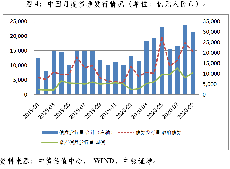 因为货币政策较财政政策更为灵活,中国货币政策自1月底起就对疫情冲击做出了政策响应,而大规模的财政对冲措施直到5月底全国两会审议通过政府预算后才正式实施。5~9月份,中国境内债券月均发行2.81万亿元,较前4个月增长29.6%,其中政府债券发行1.47万亿元,增长91.9%,占到52.4%,远高于前4个月占比13.5%的水平。在政府债券发行中,5~9月份,国债月均发行7518亿元,较前4个月增长了1.44倍。