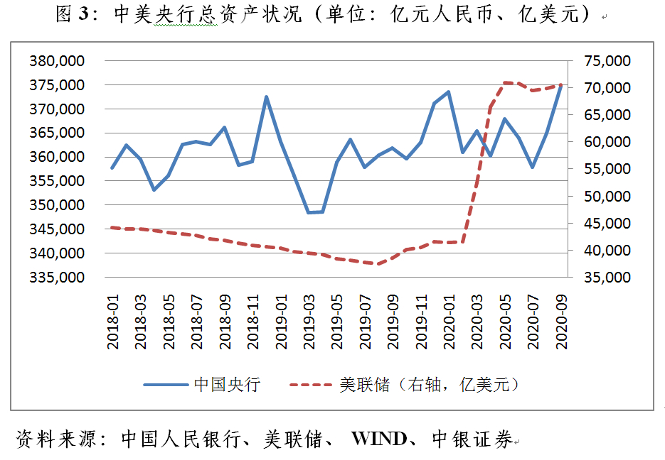 从数量工具看,中国央行资产负债表保持基本稳定,到9月末,仅较上年末增加3597亿元人民币。而美联储重启量化宽松乃至无限量宽,到9月末,扩表2.89万亿美元。并且,美联储主要通过美国国债等资产购买来实施扩表,其中新增美债购买占其前三季度扩表规模的73.2%。中国央行的数量工具主要是再贷款再贴现,以及推动银行积极办理企业贷款延期还本付息和普惠小微企业信用贷款的政策工具创新,属于专款专用的结构性工具。
