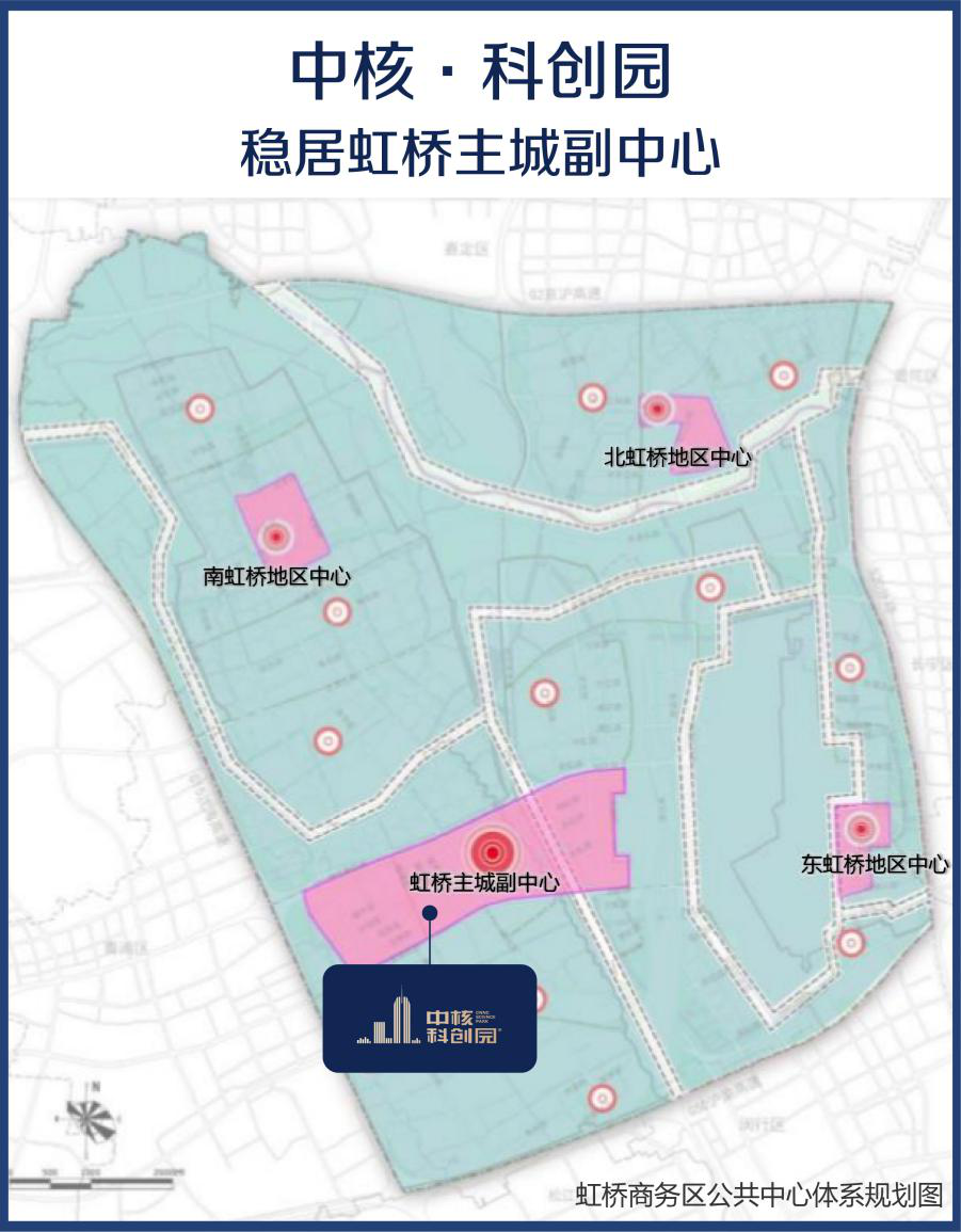 中核·科创园毋庸置疑处在虹桥商务区主城片区的正核心,西虹桥片区之内,与国家会展中心距离仅1.2公里,坐落在2号线西延伸段徐民路站(暂定名)正地铁上盖之上。