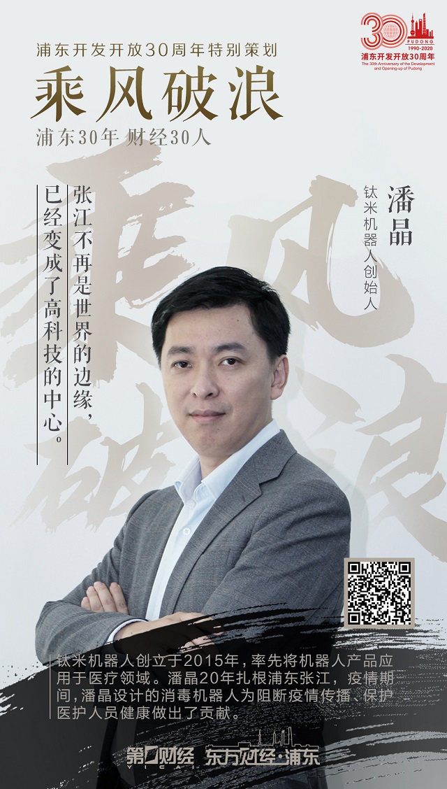 潘晶,钛米机器人创始人, 中国机器人产业的第一批弄潮儿。上海交通大学机器人硕士专业毕业后, 潘晶在大公司从事机器人系统的设计和开发工作,主持参与了国内外数十个机器人项目。2015年离职创立钛米机器人,专注于智能医疗服务机器人平台的研发,率先将机器人产品应用于医疗领域,进入全国数百家医院。潘晶20年扎根浦东张江,在张江完成从外企职员到创业者的角色转变。疫情期间,潘晶设计的消毒机器人为阻断疫情传播、保护医护人员健康做出了贡献。