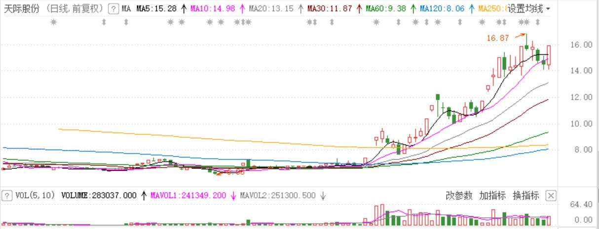 从盘面上看,9月初以来,天际股份的股价一路上涨,从9月11日的最低7.53元,涨到10月21日的最高16.87元,短短17个交易日涨幅超过124%;如果从7月28日的最低点6.06元算起,则短短两个多月涨幅近2倍。