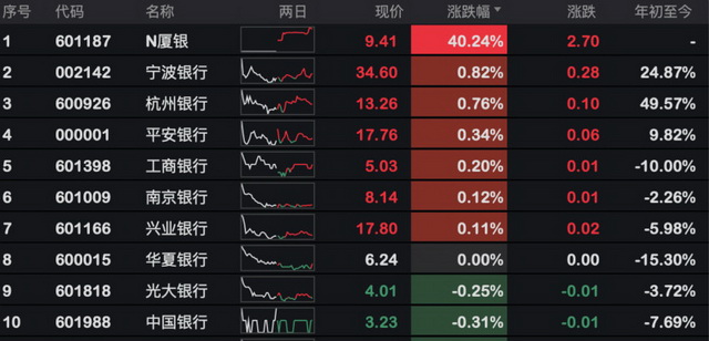 一位银行业分析师对第一财经记者称,从上市首日的涨幅看,相较去年上市的8家银行股的表现,厦门银行40%左右的涨幅并不算高,但此时正值A股震荡之际,再加上今年以来银行还承担着减费让利的任务,银行指数下跌较为明显,在市场情绪尚不明朗的情况下,厦门银行的表现尚可。