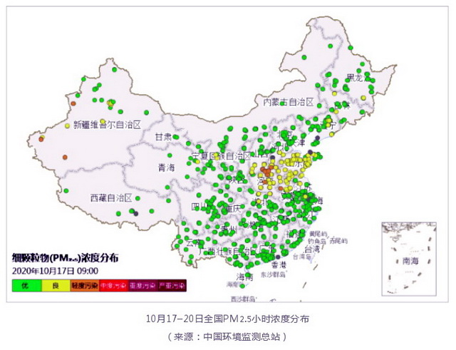 10月17日起,京津冀及周边地区、苏皖鲁豫交界地区和东北地区出现一次大范围的细颗粒物(PM2.5)污染过程。这是今年入秋以来范围最广的PM2.5污染过程,其中环渤海地区污染程度相对较重。