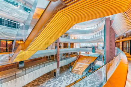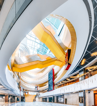在挑空的中庭下,无边界大楼梯、环绕观景台,形成一个让人流连忘返、集合交流、探索、艺术、互动、共享等功能的综合空间,消化商业与办公共同的社交需求,成为生活与工作互为转变的契机 ,让商业与办公的过渡节奏自动放缓,在项目内部就直接形成了“商办共圈的内循环”。
