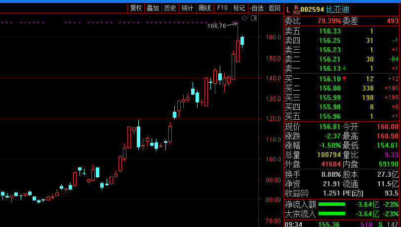 周五早盘,比亚迪高开低走。截至发稿,报156.10元,跌1.5%,成交金额已接近30亿元,位居两市首位。