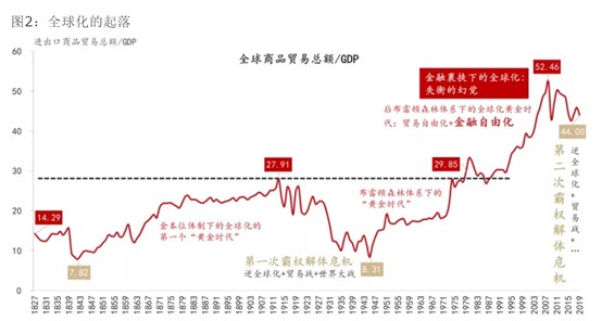 全球化进程在柏林墙倒塌与冷战结束后提速,并因中国加入WTO而达到高潮,但这一趋势在2008年金融危机之后出现逆转。从进出口商品贸易总额占GDP的比重来看,2008年的52.46%是二战后全球化黄金时期的峰值(图2)。