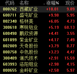 周二早盘,有色钴快速走高,截至发稿,西藏矿业率先拉升涨停,盛屯矿业涨停,格林美大涨6%,天齐锂业、寒锐钴业、华友钴业等纷纷拉升。