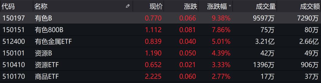 有色金属板块今日强势崛起,申万有色金属行业指数涨幅以4.31%的涨幅位居申万一级行业榜首。场内相关主题基金悉数收涨,其中,有色B(150197.SZ)涨幅超过9%,有色800B(150151.SZ)涨幅超过7%。