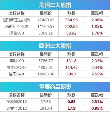 截至收盘,道指上涨555.00点,涨幅2.06%,报27480.03点;标普500指数上涨58.90点,涨幅1.78%,报3369.16点;纳指上涨203.00点,涨幅1.85%,报11160.57点。