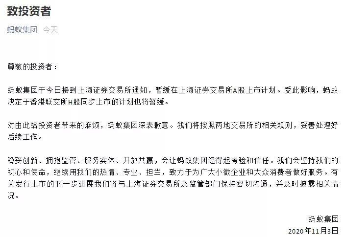 蚂蚁集团官方微信11月3日晚发布致投资者信:蚂蚁集团于今日接到上海证券交易所通知,暂缓在上海证券交易所A股上市计划。受此影响,蚂蚁决定于香港联交所H股同步上市的计划也将暂缓。对由此给投资者带来的麻烦,蚂蚁集团深表歉意。我们将按照两地交易所的相关规则,妥善处理好后续工作。