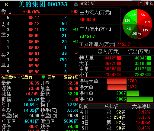 11月4日早盘,美的集团股价持续拉升,截至发稿,该股涨超4%,报86.05元,再创新高,市值突破6000亿元。