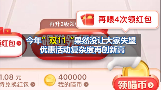 活动越来越复杂,红包越来越难抢。近几年的“双11”,各大平台和商家都会推出相似的抢红包,抢优惠的促销活动或者游戏,但是这些活动的规则正变得越来越复杂。为了得到并不算太多的优惠,用户需要耗费大量精力和时间,不少网友吐槽,自己陷入了深深的套路之中。多点真诚,少点套路的优惠政策什么时候能到来?点击视频,一看究竟。