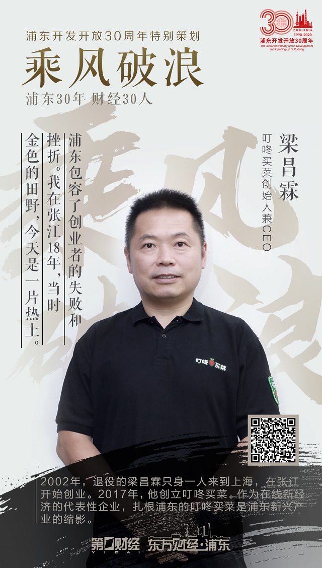 梁昌霖,叮咚买菜创始人。国防科技大学毕业后,部队服役十余年。2002年,退役的他只身一人来到上海,慕名到张江创业。2017年,梁昌霖创立叮咚买菜,在上海浦东建立了第一个前置仓,逐渐形成了一种高速成长的生鲜电商新业态,在没有任何巨头加持的环境下,叮咚买菜做到与阿里旗下的盒马鲜生、腾讯合作的每日优鲜分庭抗礼。作为在线新经济的代表性企业,扎根浦东的叮咚买菜是浦东新兴产业的缩影。