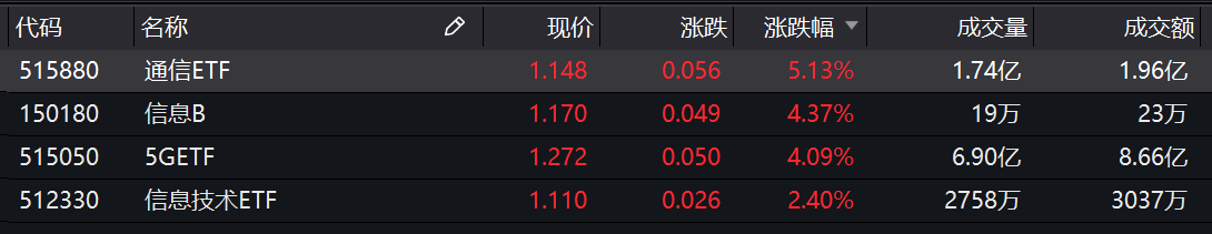 11月5日,A股5G概念板块在午后全线爆发,申万通讯行业上涨5.32%,领跑当日申万一级行业。基金方面,通信ETF(515880.SH)涨幅超5%。