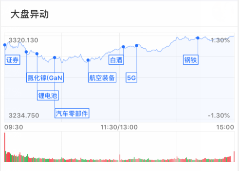 11月5日,欧美股市大涨提振市场情绪,两市延续上涨势头,沪指跳空高开站上3300点,盘中指数虽上演“高开低走”一幕,但随后便快速拉起,午后市场持续走高,截至收盘,三大指数均涨超1%。盘面上,行业板块普涨,白酒、汽车、5G概念、苹果概念等板块涨幅居前,仅有航天航空、船舶制造等少数板块走弱。