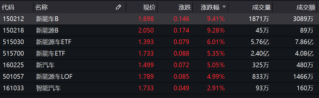 今日,新能源板块延续火热势头。数据显示,Wind新能源汽车指数涨超4%,比亚迪(002594.SZ)尾盘强势封涨停,股价续创新高。场内基金方面,新能车B(150212.SZ)、新能源B(150218.SZ)涨幅均超9%,新能源车ETF和新能车ETF等也纷纷跟涨。