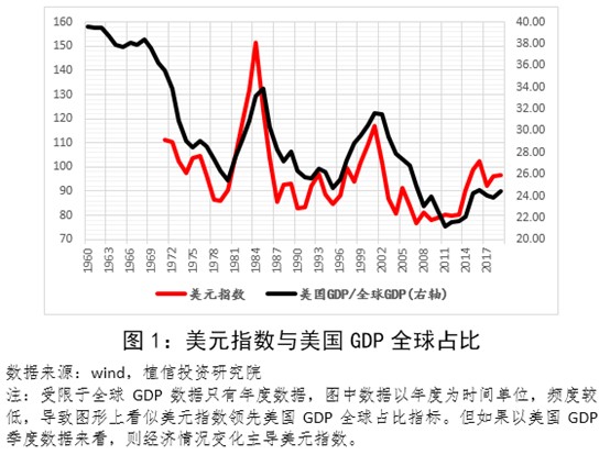美元指数是综合反映美元在国际外汇市场汇率情况的指标,用来衡量美元对一揽子货币汇率变化的程度。其构成中权重货币比例分别为欧元(57.6%)、日元(13.6%)、英镑(11.9%)、加元(9.1%)、瑞典克朗(4.2%)、瑞士法郎(3.6%)等等。事实上,美元指数走势反映的是美国经济的全球重要性的变化。世界对美国商品和美元资产的需求增大,美国经济的全球重要性就会提高,美元指数就会上升,反之则反是。这一点从美国GDP的全球占比变化和美元指数的走势高度吻合以及前者存在明显的引领性中可以得到印证。