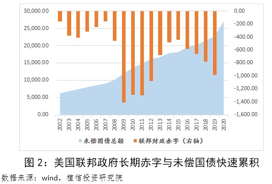 截至2020年9月,美国联邦政府当年财政赤字已累计至2.7万亿美元,美国国会预算办公室估计,2020年美国联邦政府财政预算赤字将飙升至3.1万亿美元,约占GDP的比重为15.2%,创1945年以来新高。2019年末,美国国债未偿余额为22.7万亿美元,约占同期GDP的106.02%。截止到9月,未偿余额扩张至26.9万亿美元,幅度为近五年来的总和,2021年可能占GDP比重达到130%。按照30万亿美元平均10年期国债估算,扣除军事医疗等支出之后,未来美国政府财政收入将无法归还利息,严重时返还本金都有困难。