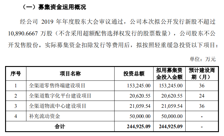 在“募集资金投资项目”当中,其中最大的项目是“全渠道零售终端建设项目”,本项目计划未来3年在江苏、安徽、四川、广东、重庆等22个省(市)建设300家数字化直营门店,从而进一步完善公司的零售终端网络布局。同时,公司将对C端数字化平台进行全面升级改造,推进门店数字化功能和线上销售平台的迭代,加强全渠道融合,提升公司的市场占有率和品牌知名度,满足消费者不断升级的购物需求。本项目计划总投资额为15.32亿元。