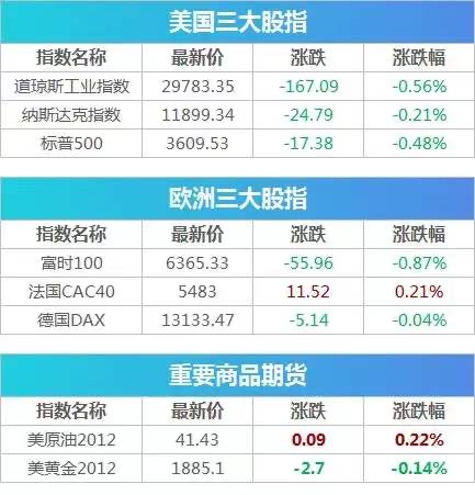 截至收盘,道指下跌167.10点,跌幅0.56%,报29783.35点;标普500指数下跌17.40点,跌幅0.48%,报3609.54点;纳指下跌24.80点,跌幅0.21%,报11899.34点。此前交易日,道指和标普500指数均创下收盘新高。