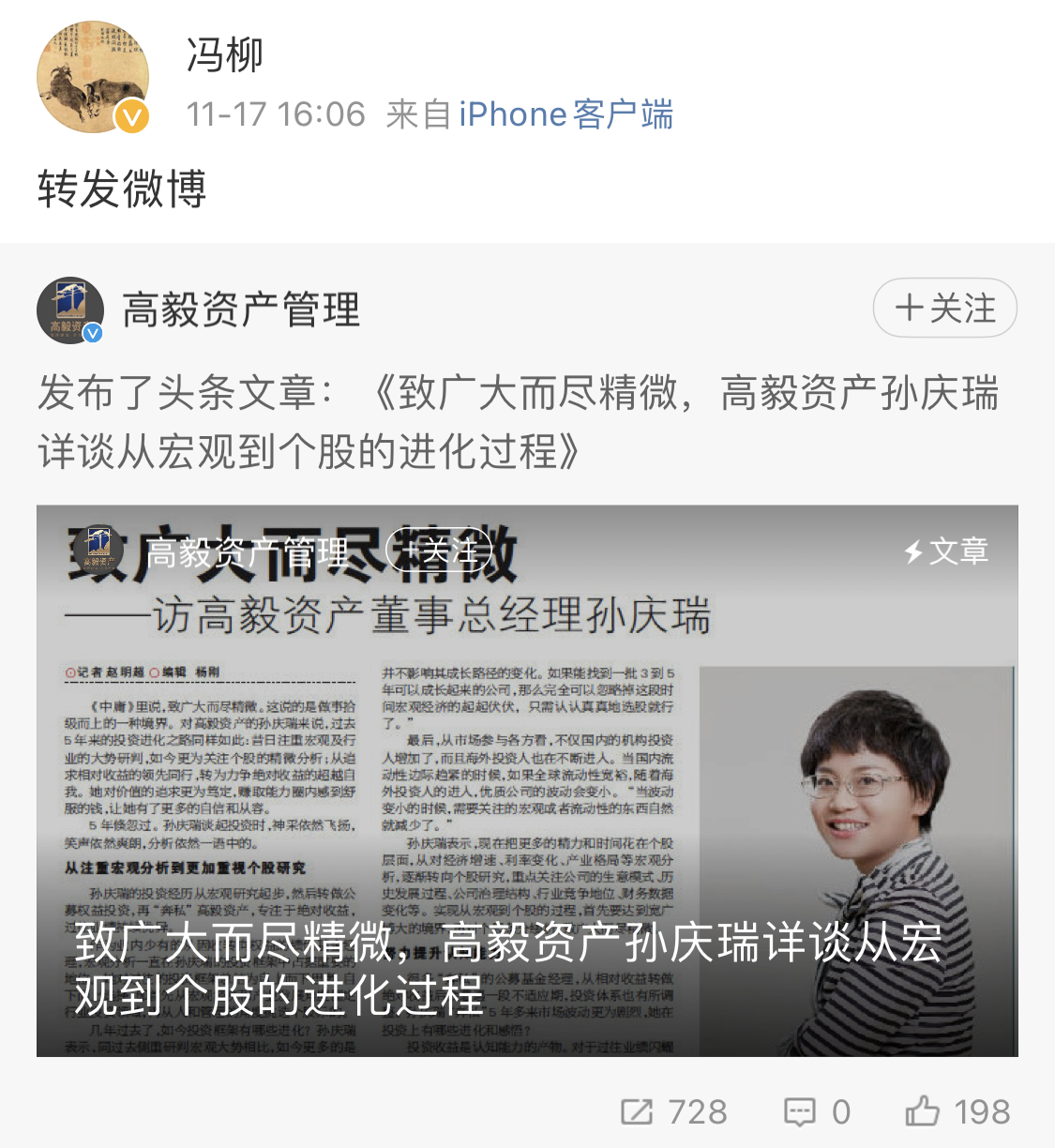 在此之前,16点6分,甚少露面的高毅资产冯柳在个人微博转发一篇题为《致广大而尽精微,高毅资产孙庆瑞详谈从宏观到个股的进化过程》的专访,专访刊发时间为10月20日。
