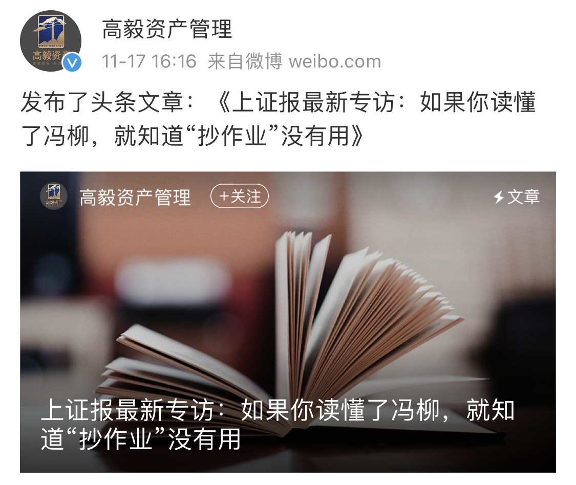 认证为“高毅资产管理”的微博转发了《上证报最新专访:如果你读懂了冯柳,就知道“抄作业”没有用》,专访时间发生在6个月前,刊发时间为5月23日。