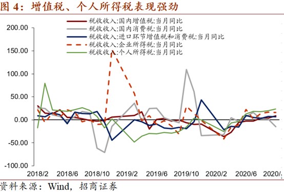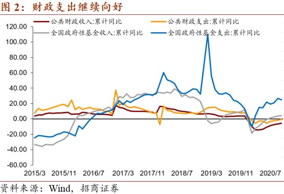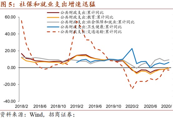 10月财政支出同比增速19.03%,较9月的-1.11%大幅上升,可能与全面推进小康社会建设有关。其中,中央财政支出增速1.60%,较上月下降11.25个百分点,地方财政支出增速23.63%,较上月上升26.52个百分点。具体看,文化旅游增速-4.53%,较上月下降20.31个百分点。农林水事务同比增速-1.96%,较上月下降77.29个百分点。卫生健康同比63.06%,较上月大幅上升67.55个点百分点,可能与青岛、新疆疫情有关。社会保障和就业同比增速30.52%,较上月大幅上升41.16个百分点,可能与全面推进小康社会有关。城乡社区事务同比558.23%,较上月上升610个百分点。由于找不到月度的细分项,我们猜测可能与小城镇基础设施建设有关,这也是全面推进小康社会的体现。与9-10月份,中小型挖掘机销量同比增速上升一致。