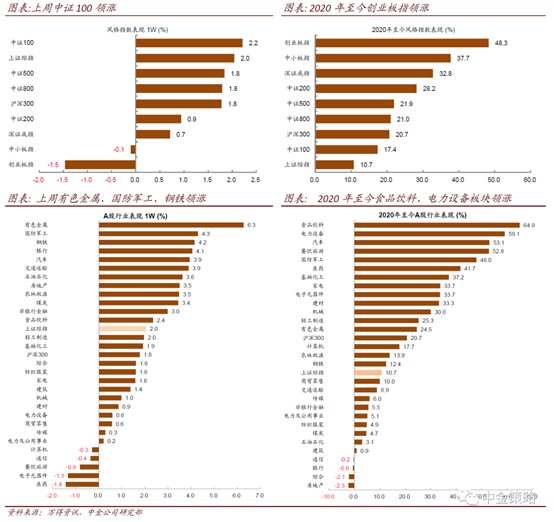 上周在周报中强调《周期领涨》,上周市场表现符合这一预期。近期海外有多家公司疫苗开发取得积极进展,市场对全球的经济复苏进展不断调整预期,在疫苗进展的推动、经济复苏的上行周期中,我们认为疫情期间受损较多、恢复较慢的相关行业有望追赶,顺周期的相关行业也有望受益,而先前估值较高的成长性行业则有可能出现调整。我们从8月份开始一直强调在新经济已经大幅领涨后“新老更加均衡”,当前环境依然适用,后续高度关注增长复苏及政策退出节奏。上周有几方面的进展值得关注: