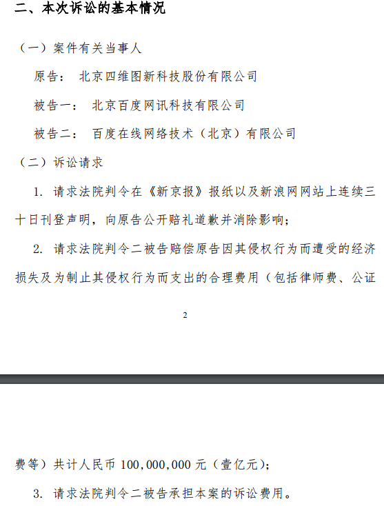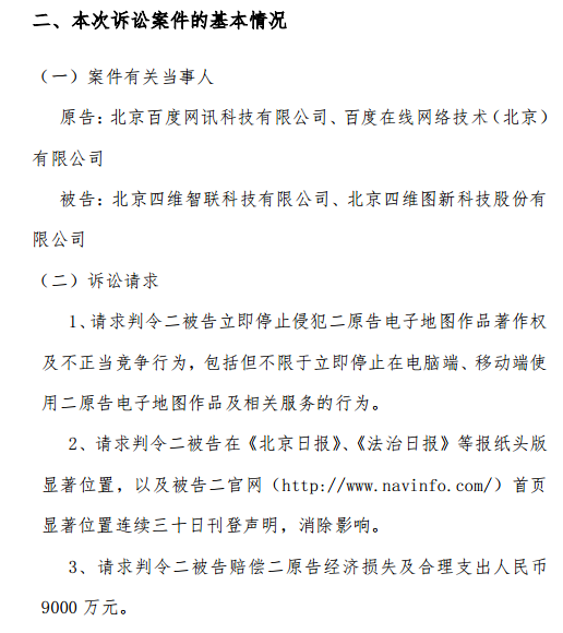 11月25日晚,四维图新发布公告,今日收到北京市海淀区人民法院诉讼材料,材料显示百度公司就与四维智联、四维图新的著作权侵权及不正当竞争纠纷于10月23日向北京市海淀区法院提起诉讼,北京市海淀区法院已正式受理,公司于11月25日收到《传票》、《民事起诉状》等诉讼文件。