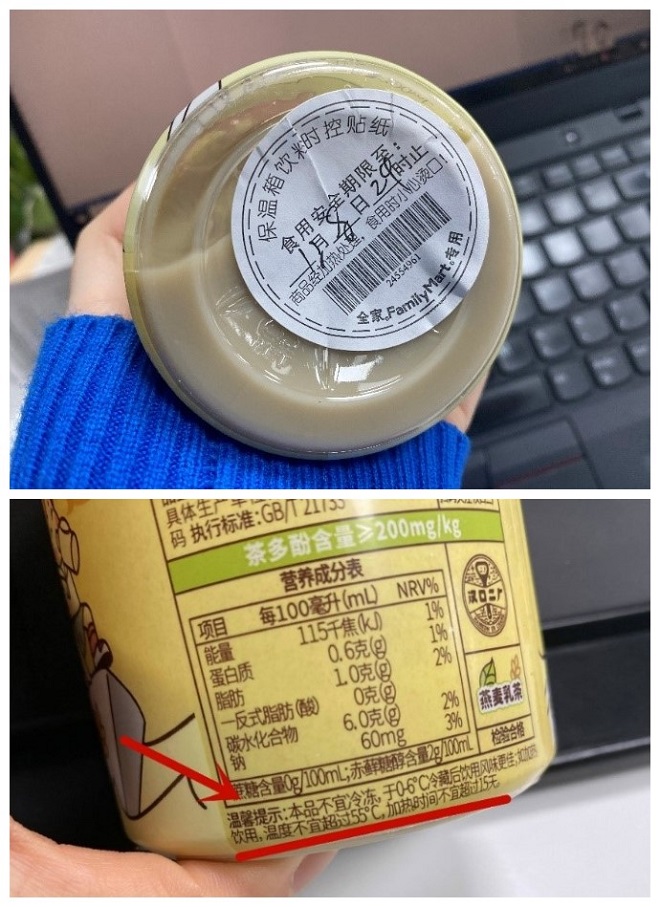 为什么不能用更高的温度?毕竟大部分饮料包装都是塑料制的。放在暖柜里的饮料,都有安全饮用期限。全家暖柜的暖饮瓶底,都贴有一张“保温箱饮料时控贴纸”。而在饮料瓶身,也可以看到品牌标注的温馨提示:“如加热饮用,温度不宜超过55℃ ,加热时间不宜超过15天” 。这在某种程度上也意味着瓶装热饮比常温、冷藏饮料有更高的成本。