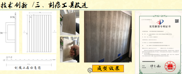 技术创新层面,竖向构件采用铝模,水平构件采用木模可大幅降低成本,采用铝木结合转换件,有效解决了水平与竖向结合部位木模与铝模的有效连接问题,该项工艺获得了国家专利证书。另外,优化刻痕板,方便持握,有助于提升刻痕施工质量,该项工艺获得了国家专利证书。