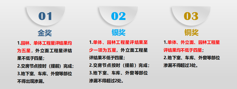 参评“荣盛杯”项目要求各分项工程星评不低于三星,其中装修、外立面、园林均不能低于四星。奖项分为金、银、铜三种,只是想要拿到任何一个奖项都绝非易事,各种考核的“KPI”要求都很高。