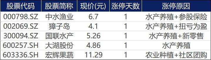 27日,农牧饲渔板块大幅走高,水产、猪肉、鸡肉、称霸涨幅榜。其中,中水渔业(000798.SZ)、獐子岛(002069.SZ)、国联水产(300094.SZ)、大湖股份(600257.SH)、宏辉果蔬(603336.SH)五只个股涨停,鸡肉、猪肉虽然板块整体涨幅不错,但属于普涨行情,未出现涨停股。