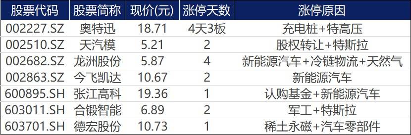 今日农牧饲渔板块大幅走强,直觉告诉我没有板块会比它拥有更多的涨停股了,但现实告诉我,我错了。新能源产业链近期持续贡献涨停股,今日,奥特迅(002227.SZ)、天汽模(002510.SZ)、龙洲股份(002682.SZ)、今飞凯达(002863.SZ)、张江高科(600895.SH)、合锻智能(603011.SH)、德宏股份(603701.SH)七股涨停。其中,天汽模有大股东易主的预期;奥特迅或受到了特斯拉(TSLA.US)计划来华制造充电桩的消息刺激,目前已4天3板,昨日公司发出了股价异常波动的提示。