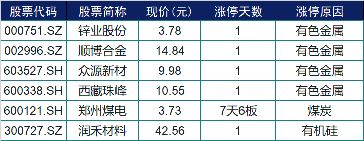 顺周期的有色金属板块依旧活跃,早间“煤飞色舞”演绎得淋漓尽致,锌业股份(000751.SZ)、顺博合金(002996.SZ)、众源新材(603527.SH)、西藏珠峰(600338.SH)等掀起涨停潮。