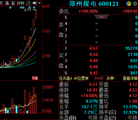 盘面上,动力煤期货主力合约今日大涨4.02%,煤炭板块顺势大涨。截至收盘,郑州煤电录得九天八板,收报4.51元,9日累计涨92.74%,股价接近翻倍。