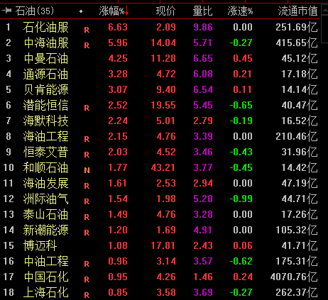 周四早盘,石油板块个股涨幅明显。截至发稿,石化油服、中海油服涨超5%,中曼石油、通源石油、贝肯能源等涨逾3%,板块指数接近1%,位居涨幅榜前列。
