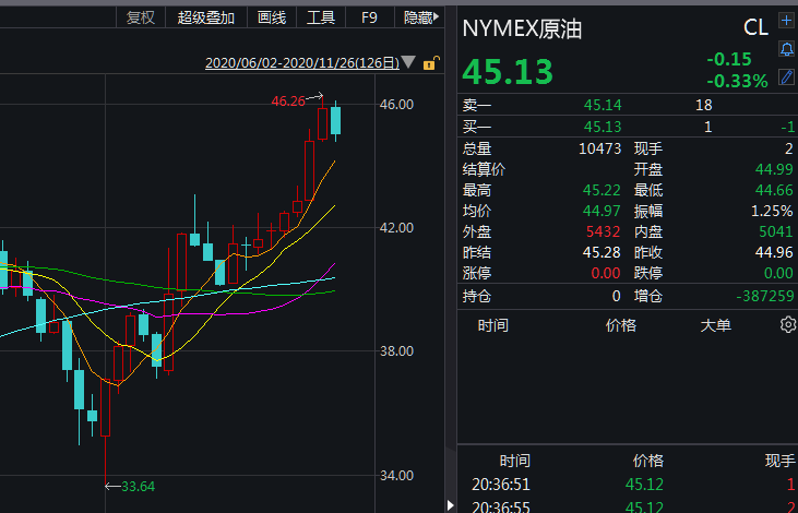 国际油价2日显著上涨。截至当天收盘,纽约商品交易所2021年1月交货的轻质原油期货价格上涨0.73美元,收于每桶45.28美元。自11月初至今,国际油价已反弹30%。