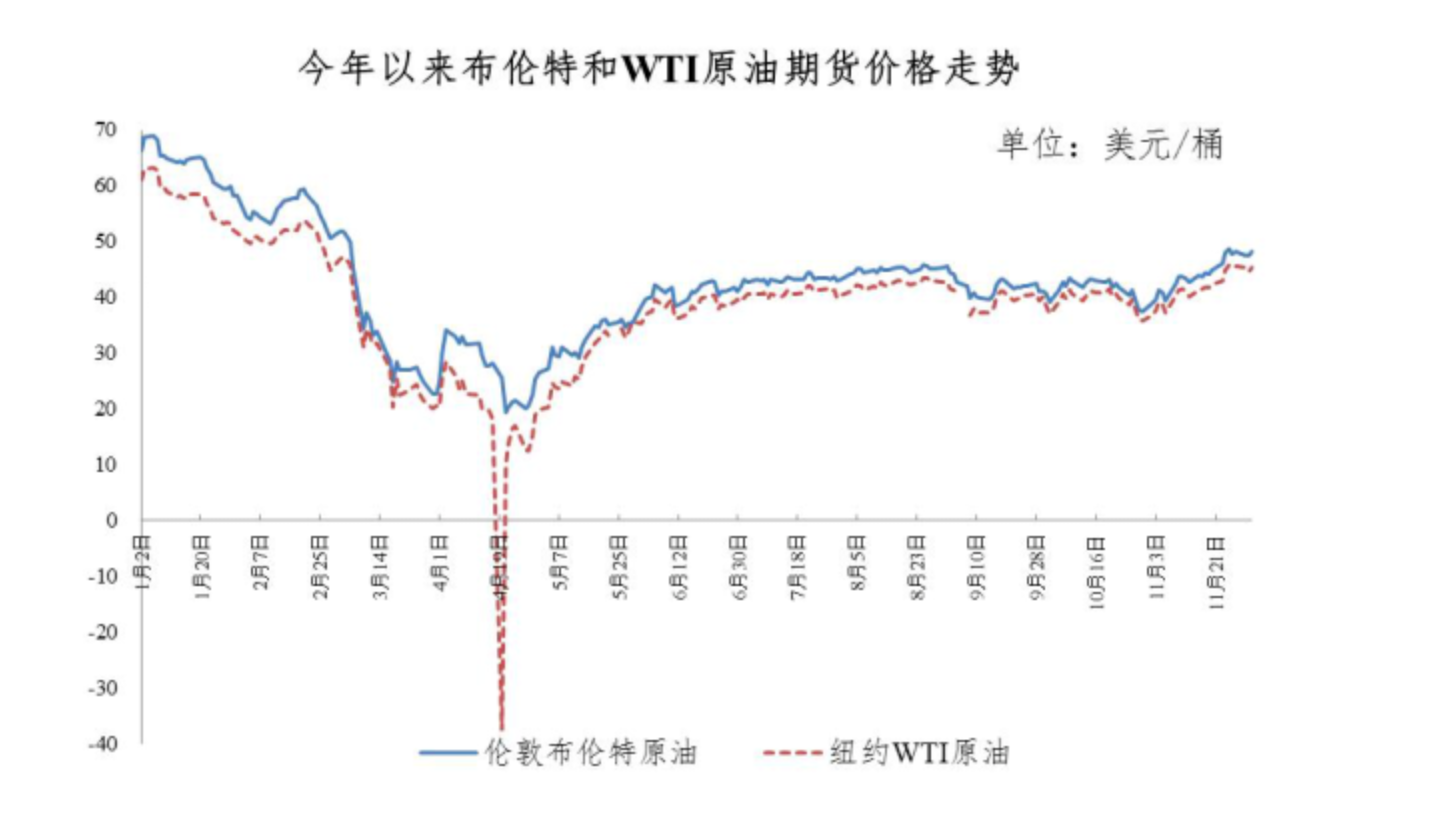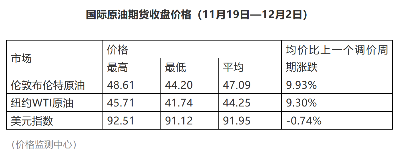从近两次调价周期来看,多支疫苗先后宣布有效、英国率先批准近期大规模接种的消息提振市场信心,部分抵消了疫情仍在欧美多国蔓延对原油需求带来的负面影响。对欧佩克及其盟友延续减产额度的乐观预期、美国原油库存连续两周下降等因素也对油价产生支撑。多方因素作用下,上月油价累计上涨超过27%,目前已涨至今年3月初以来高点。平均来看,本调价周期伦敦布伦特、纽约WTI原油期货价格分别为每桶47.09美元、44.25美元,分别比上一调价周期上涨9.93%、9.30%。