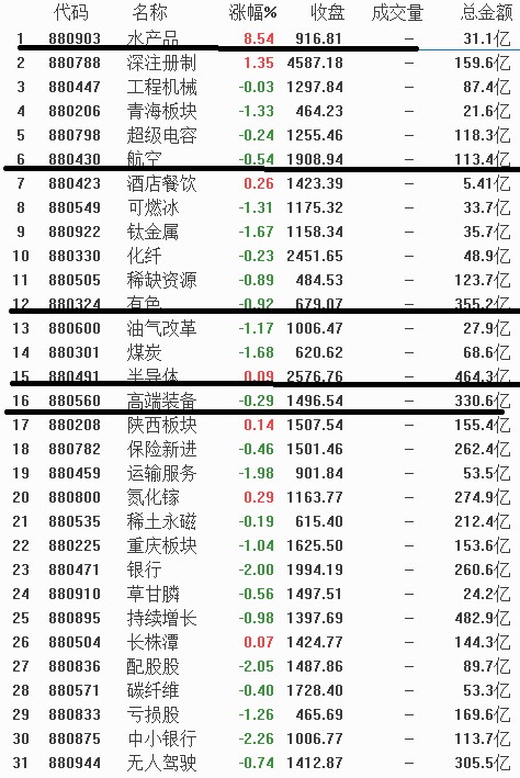 另一方面,近期表现持续性较强的有色板块中仍然有钛金属,稀缺金属,稀土永磁等占据4席,表明对于场内资金来说,有色板块还是强势板块。与此同时,高端装备板块的排名继续靠,这也是本轮反弹中有持续性的方向之一。因此,从资金流向上来看,整体市场的主流热点依然有资金重点关注。明天盘中航空, 有色,高端装备仍然将继续跟踪,不过今天异军突起的水产品板块能否持续走强有待考量。