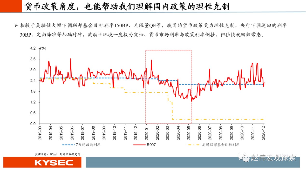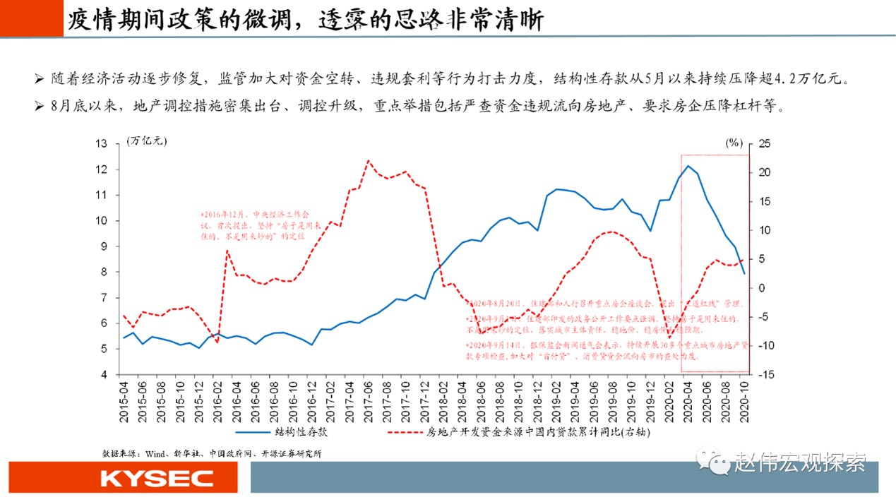 7月部分城市的地产调控政策已经开始收紧,8月“三条红线”的调控政策出台,随后的一段时间,领导讲话时开始频繁提及防风险、稳杠杆、政策正常化等。防风险,防的主要是旧增长模式下多年积累下来的问题,“稳”杠杆隐含的是结构性“去”杠杆。再比照海外,以美国为例,财政刺激规模占去年支出比重高达34.5%,远高于中国的10%左右;货币政策层面,3月上旬与中旬两次降息直接降利率降至0-0.25%,无限量的量宽,导致资产负债表大幅扩张。在经济远未修复到位的时候,国内稳增长的政策局部政策就开始逐步退潮,这与传统周期大为不同,为什么会这样?放在转型框架下就很好理解了。近些年,政策的重心自始至终都在“调结构”上,“调结构”的大背景下,政策对“结构性问题”的累积,容忍度较传统周期要低很多。换句话讲,“稳增长”是为“调结构”创造相对平稳的宏观环境,如果影响到“调结构”就本末倒置了,这时候就需要政策适当“微调”以应对。