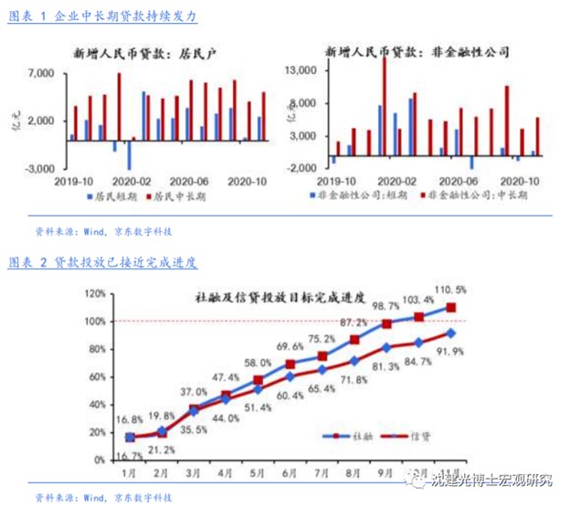 12月9日央行公布了11月社融及信贷数据。其中,贷款和社融当月分别新增1.43和2.13万亿,同10月相比有明显回升、总体符合市场预期。以社融和M2增速衡量,四季度为保障经济持续复苏,货币政策没有转向、在总量上依然保持着宽松态势,结构上强调精准滴灌、全力输血实体经济。