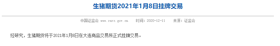 12月11日,证监会称,经研究,生猪期货将于2021年1月8日在大连商品交易所正式挂牌交易。