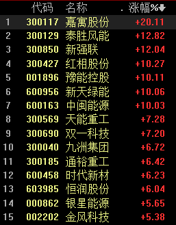 12月14日,风电板块拉升走强,嘉寓股份大涨20%,泰胜风能、新强联涨12%,豫能控股、新天绿能、中闽能源封板。