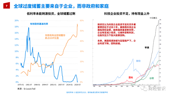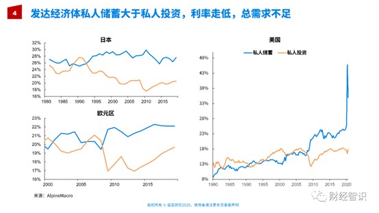 一方面储蓄越来越高,就压低了利率。但另一方面我们看到利率越来越低,政府的目的压低利率、降息是为了刺激大家去消费、刺激大家去投资,但是大家并没有做这件事情,有一部分投资,有一部分消费,但总体来讲存的钱依然是越来越多了。这张图很清晰地显示,这次疫情过后储蓄大大增加了,而不是把它花出去、投资出去或者消费掉了。